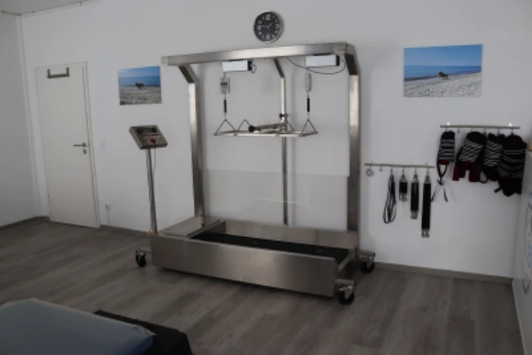 Für die effiziente Behandlung des Bewegungsapparates Ihres Hundes finden neben einem Theravet-Laufband mit Einhängevorrichtung, auf dem auch bewegungseingeschränkte oder gelähmte Hunde therapiert und rehabilitiert werden können, ein Low-Level-Laser und ein Matrix-Rhythmus-Gerät seinen Einsatz.